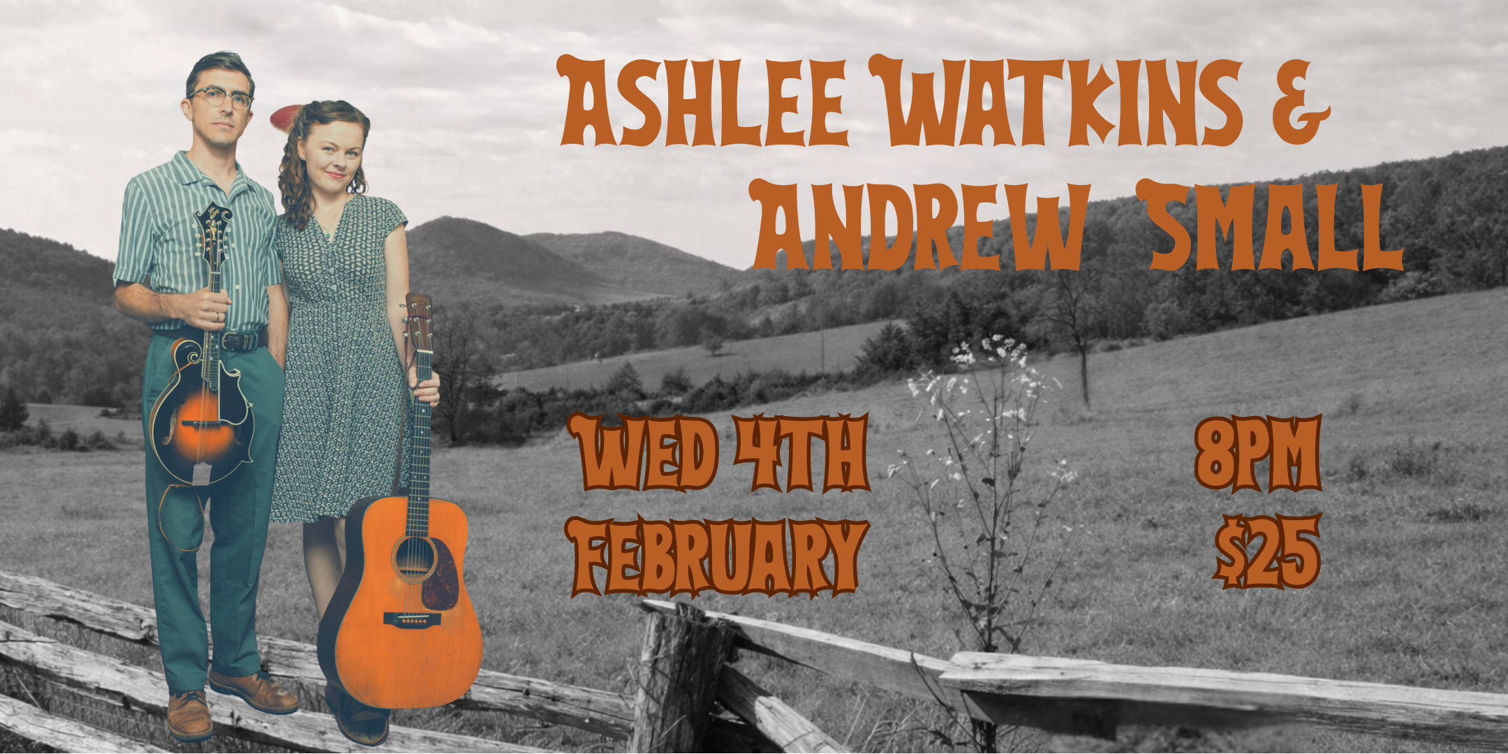 Ashlee Watkins & Andrew Small evoke a golden era of American music, when old-time, bluegrass and country music shared a stage every Saturday night. The pair render enduring classics, lesser-known gems, and their own award-winning songs with stirring harmonies that have captivated audiences around the globe. Danceable rhythms and tasteful stylings on fiddle, mandolin, guitar, and banjo complement the duo’s potent vocal blend. Making their home in the Blue Ridge Mountains of Southwest Virginia, Ashlee and Andrew are regulars at the fiddlers conventions around the region where they've won numerous top awards at festivals including those in Galax, VA; Mount Airy, NC; and Clifftop, WV - where they recently took home first in both the old time band and fiddle contests. In addition to their work as a duo, they also perform with their old - time string band, The New Floyd County Ramblers, and they tour internationally with their traditional bluegrass band, The Alum Ridge Boys & Ashlee.