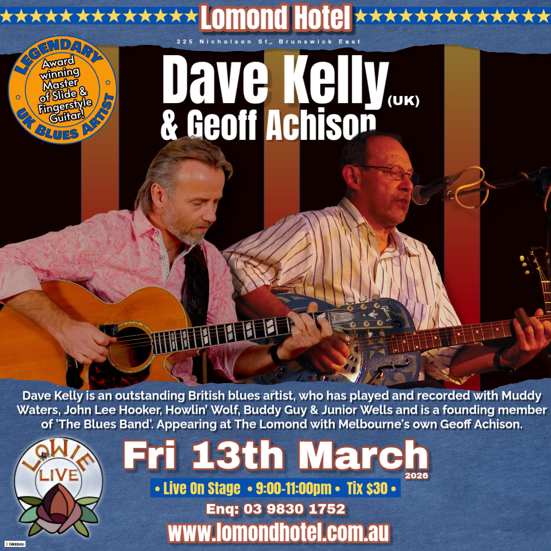 Lowie Live presents a very special evening of acoustic guitar mastery on an international scale Friday March 13th with an exclusive performance by formidable British slide guitarist Dave Kelly joined by Melbourne’s own Geoff Achison.